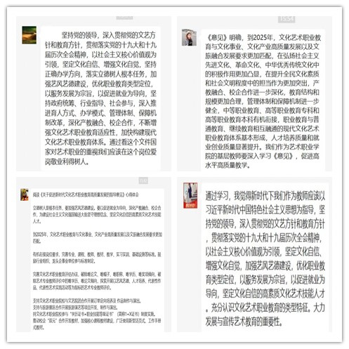进行线上线下学习的教师们也纷纷发表学习感言。表示以习近平新时代中国特色社会主义思想为指导,坚持党的领导,深入贯彻党的文艺方针和教育方针,以社会主义核心价值观为引领,坚定文化自信,增强文化自觉,坚持正确办学方向,落实立德树人根本任务,加强艺风艺德建设,优化职业教育类型定位,以服务发展为宗旨,以促进就业为导向,深化产教融合、校企合作,不断增强文化艺术职业教育适应性,为建设社会主义文化强国输送大批坚守理想信念、坚定文化自信的高素质文化艺术技能人才。