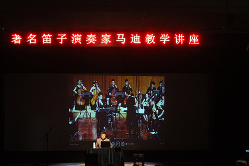 2015年12月9日下午,由陕西艺术职业学院举办,器乐系承办的长安笛韵——马迪竹笛作品赏析讲座在我院老校区小剧场举行,讲座由器乐系青年笛子教师,民族器乐教研室主任马骁老师主持,近两百名师生和校外人士参加了活动。马迪先生精彩的演讲和演奏博得了师生们热烈的掌声,原计划两个小时的讲座在现场观众意犹未尽的期待和掌声中延长至三个小时。