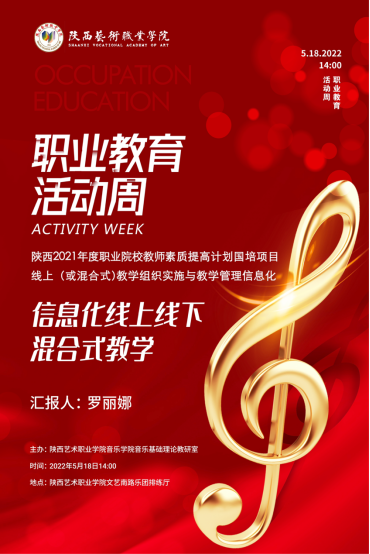 汇报以基础理论教研室主任罗丽娜老师参加国培项目内容分享为主,从线上教学、线下教学的优点、缺点,线上线下混合式教学的教学设计、以及如何实施线上线下混合式教学进行汇报。并以音乐基础理论教研室精品课程建设为案例,介绍运行实施混合式教学的情况。