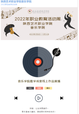 本次职业教育活动周,音乐学院特将优秀学生演出作品在官方公众号进行系列展播。面向学生、家长和社会大众开展技能服务美好生活、职业教育办学成果等方面的展示。